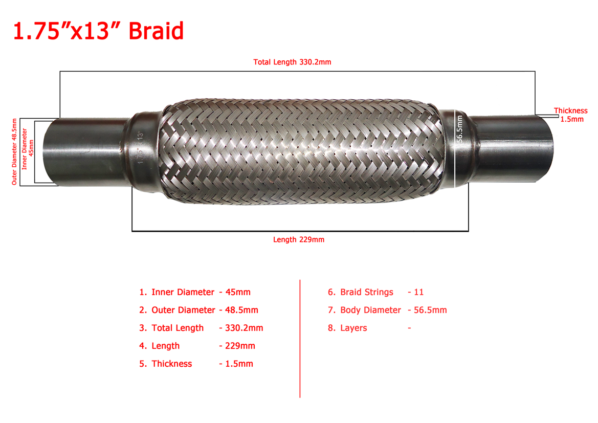 Specifications: Part No.: 003326 Diameter: 1.75 inches (45mm) Outer Diameter: 48mm Length: 13 inches (330mm) Connection Diameter: 73mm Material: High-grade stainless steel Construction: Three-layer with inner braid Application: Ideal for enhancing or replacing exhaust systems in custom and performance vehicles.