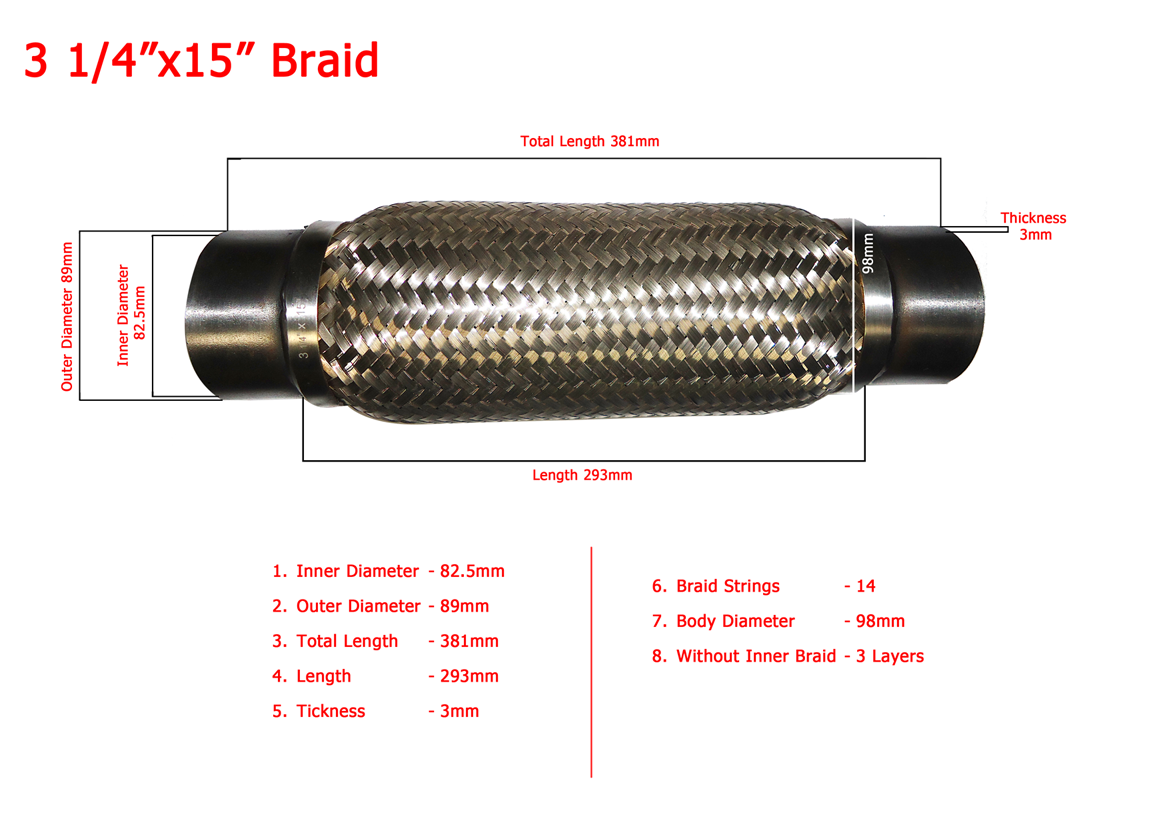 WPR Exhaust Pipe 3.25"x15", Three Layer, Inner Braid Compact Design